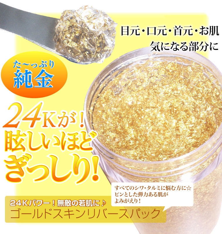 24Kパワー!24K金箔が入ったゴールドスキンリバースパックは、なんといっても24Kの量がすごい!優しく伸ばしていくと、塗った部分がほんのり温かくなります。